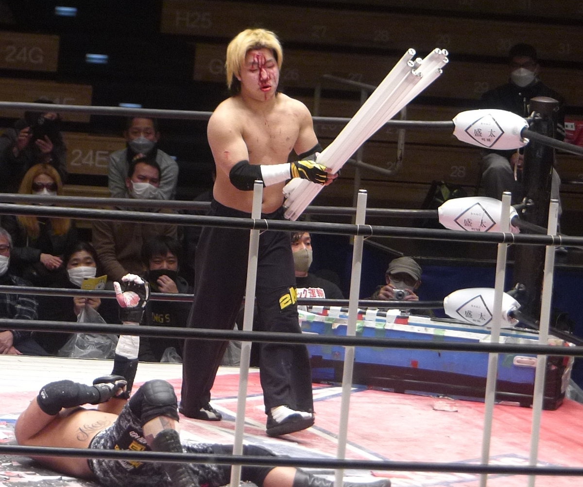 ああ若松、そうやって人の額に蛍光灯を躊躇なく当てられるレスラーになってしまったのね……いいぞもっとやれ(デスマッチ脳)なんかな、普段頭のおかしいおじ様たちがデスマッチしてるのばっかり見てるから、こんなまだあどけなさが残る子がデスマッチしてるのって、謎の背徳感あってワクワクするぞ…