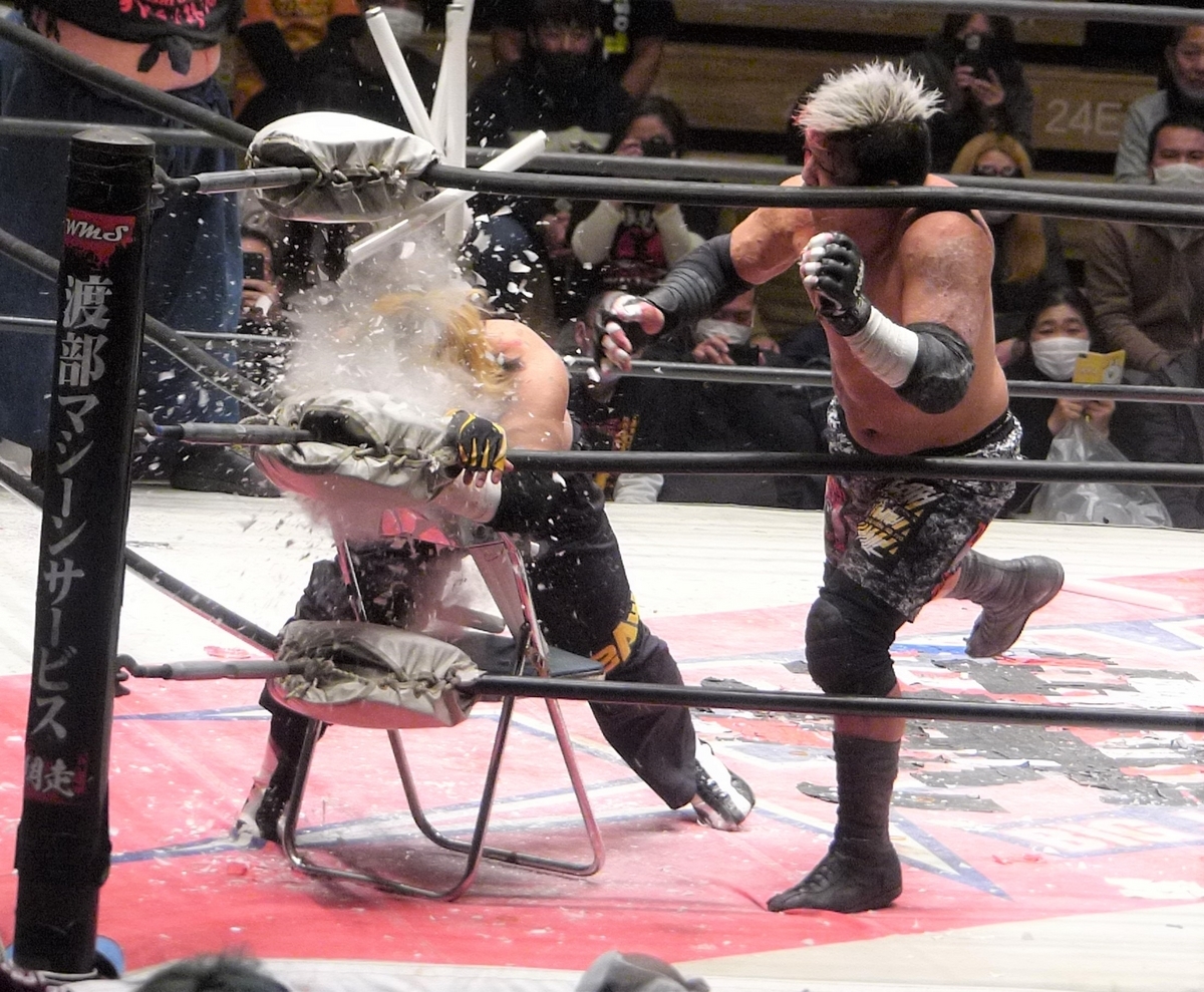 加えて若松の右腕に蛍光灯+パイプ椅子を置いて、これをパイプ椅子でぶん殴って割る。