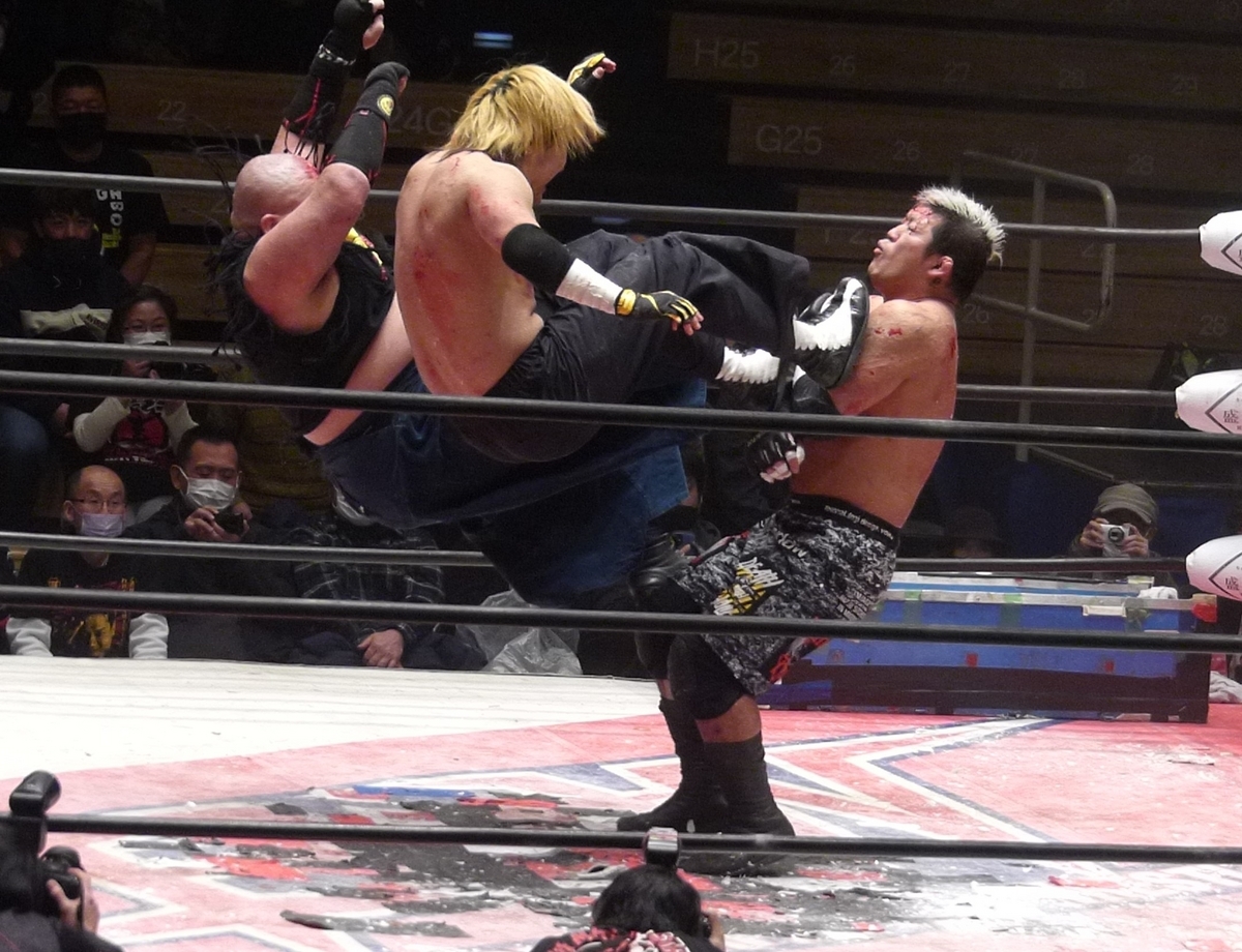 試合中全体的にそんな感じでしたが、合体技が云々とかコンビネーションがどうこうというより「何も言わなくてもお互いわかっている」感があってよかったですね。仲良しではなく、熟練の技が噛み合っているという感じ。