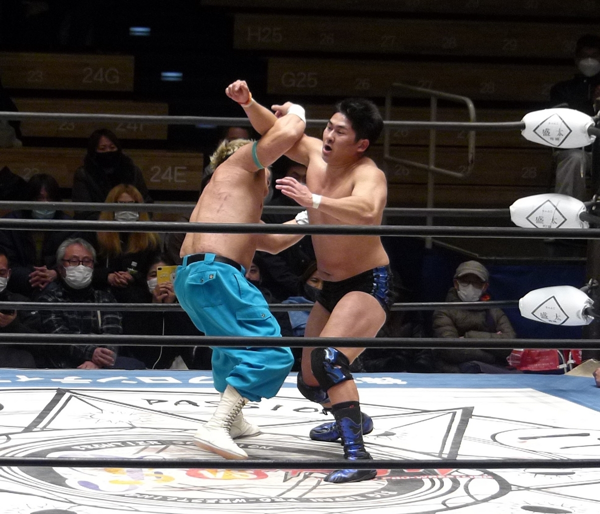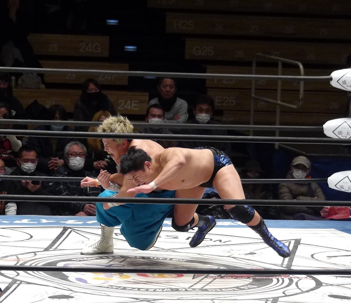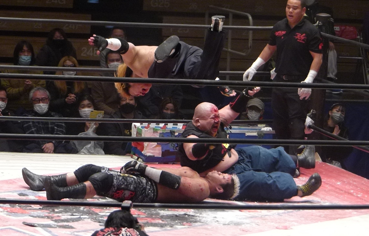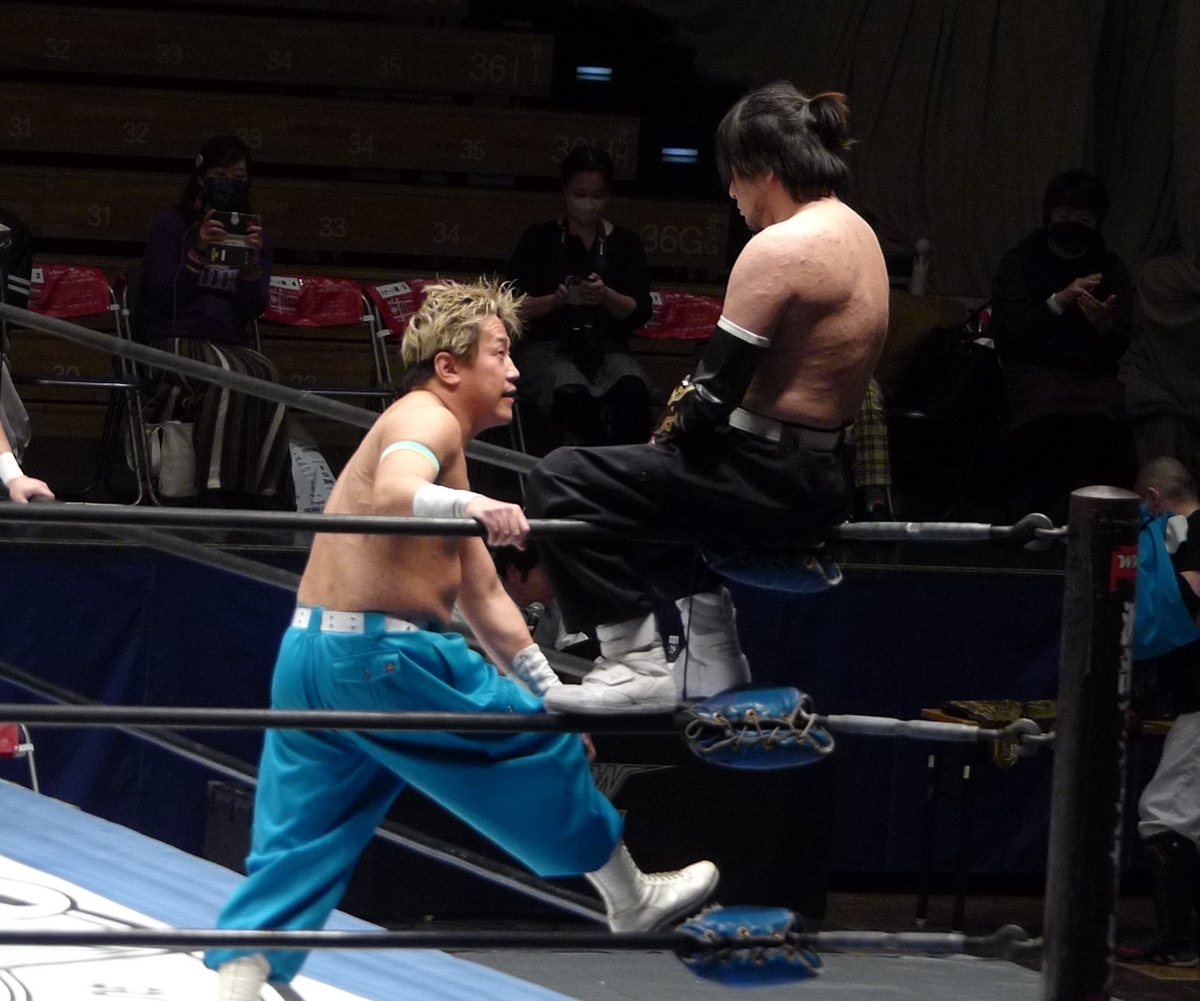 若いのは元気だし勢いがあるけど、ヤンキー二丁拳銃のお二人はテクニックが違うんよな。フィニッシュは宮本の腕十字だけど、この前に宮本が青木のラリアットを捕まえて脇固めに持ち込むという流れがありまして、ここの技術が本当に鮮やかだった。