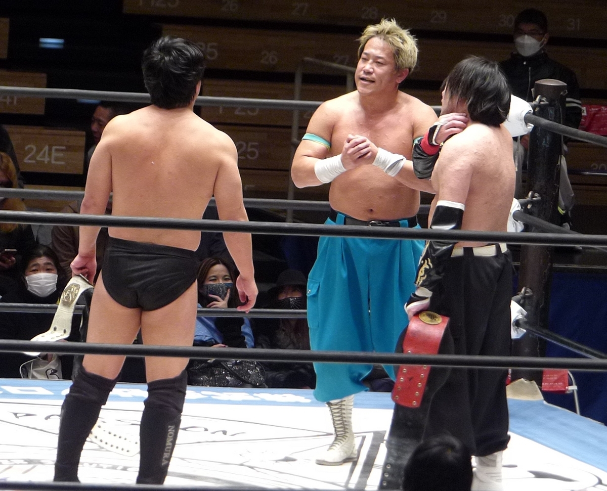 で、今野村が持ってるベルトは世界タッグ王座、アジアタッグとはまた別の全日本のタッグのベルトかな。世界タッグは、ヤンキー二丁拳銃は獲ったことはないみたいよ。ほんで今ってヤンキー二丁拳銃は全日本に定期参戦してなかった気がするけど(自信無し)思うところはあるだろうね、きっと。