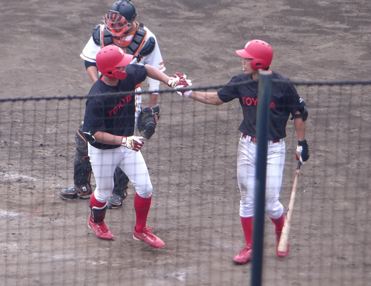 続く宮﨑君の当たりは、これも詰まりつつも二遊間とセンターの間ら辺に落ちるような当たり。これで橋本君が生還し、トヨタが1点を返します。