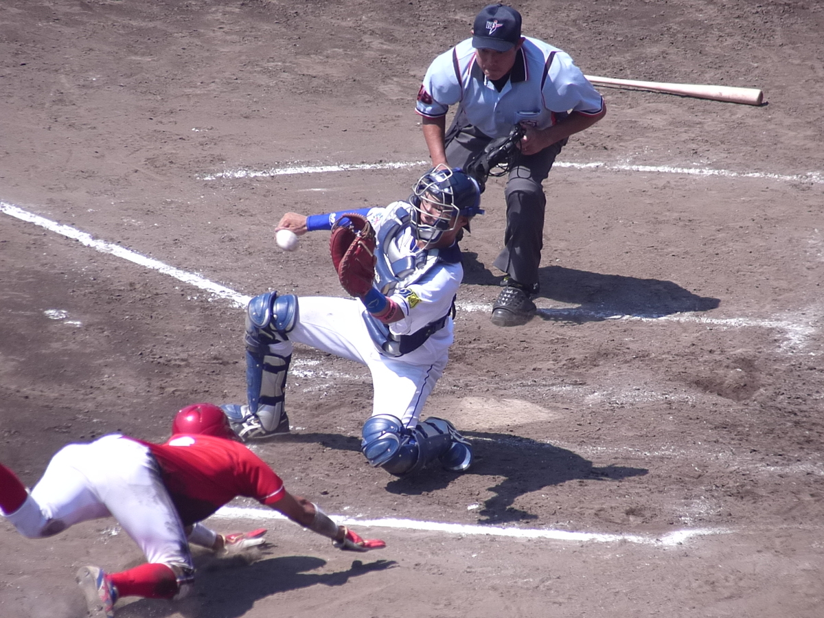 続く途中出場の辻﨑君の当たりもかなり良さげ。前進守備めのライトの頭上を越えていきそう!…と思いましたが、ここはライトの保田君が後ろ向きでダイビングキャッチ。超ファインプレーが出ました。保田君がいなければ即死だった。