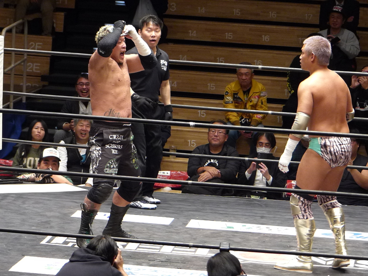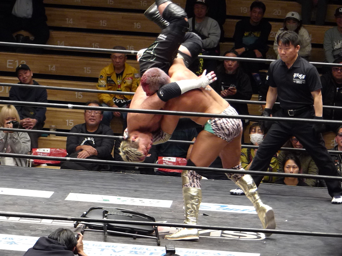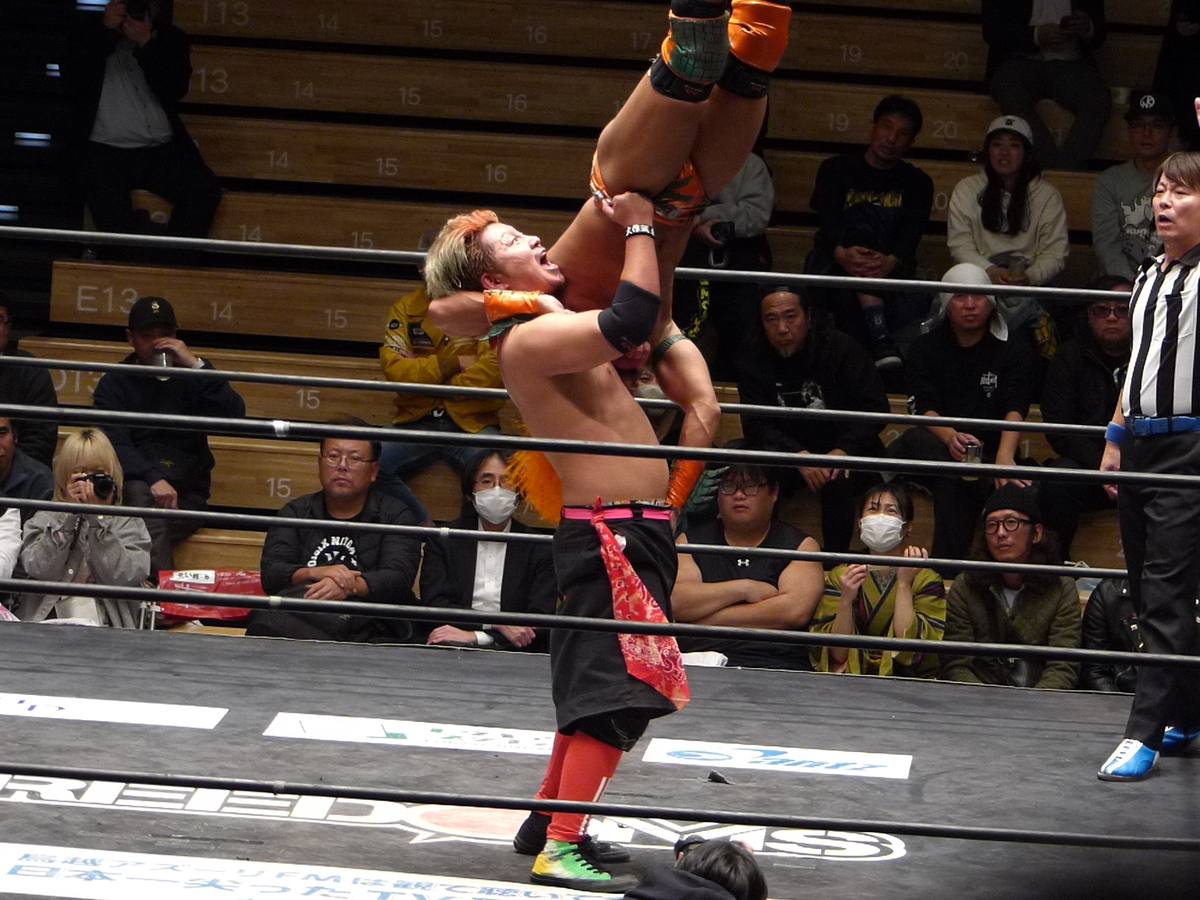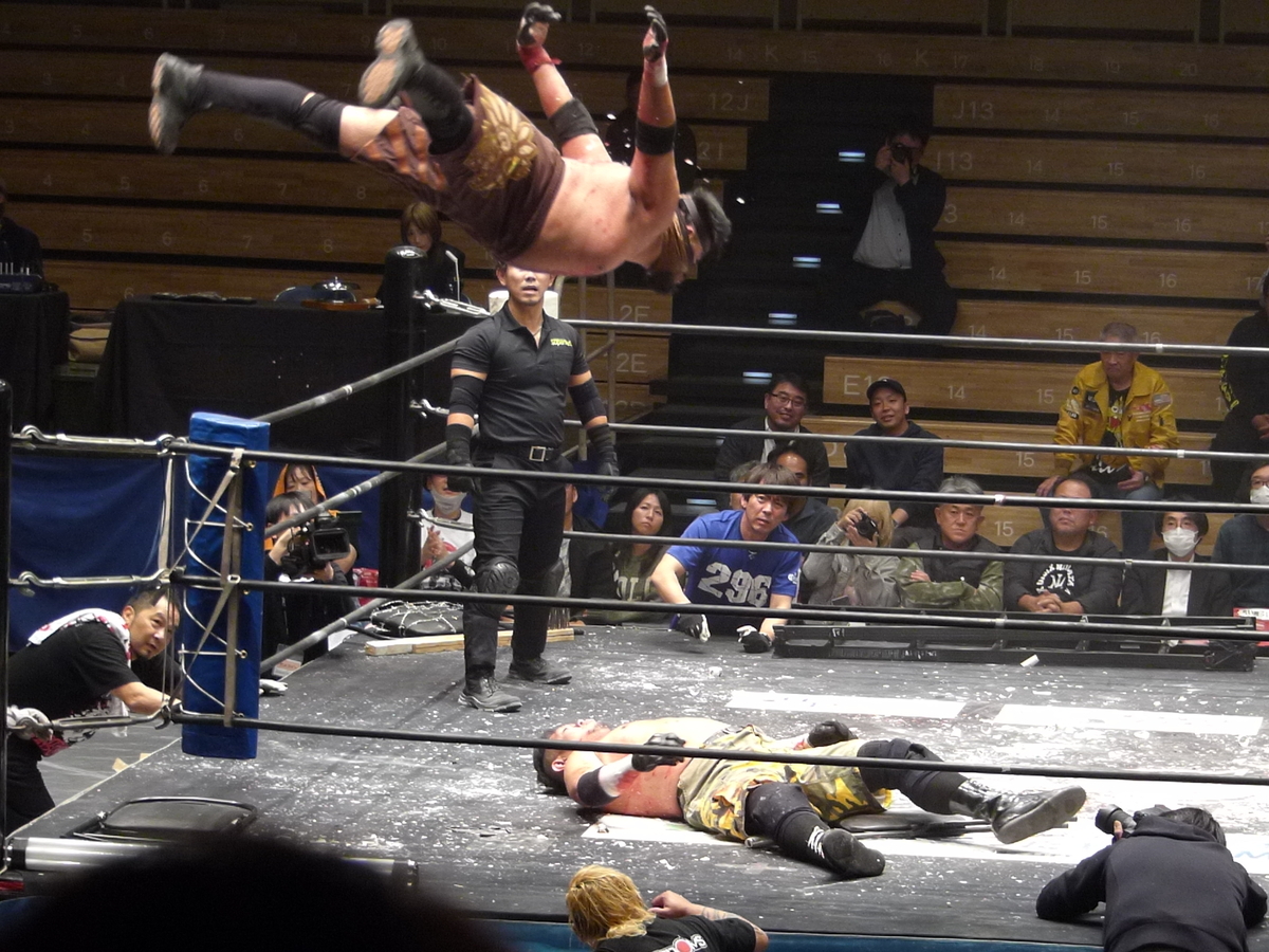 とまぁ、試合開始前から個性爆発な関札ですが、試合内容もいい。とにかくスピーディーだし、何より空中殺法が光る。今のダムズのベビーで空中殺法ができるのはリブレぐらいかな。でも単に飛んだり跳ねたりできるというアレではなくて、空中での姿勢がめちゃくちゃ良いことから、身体能力がずば抜けて高いんだなと、そういうのを感じられる選手です。あと逆水平の威力が高くて、実はパワーもあるという。ダムズのジュニア戦線は大分マンネリ気味ですが、関札も本格的に絡んできたら面白くなりそうだなぁ。