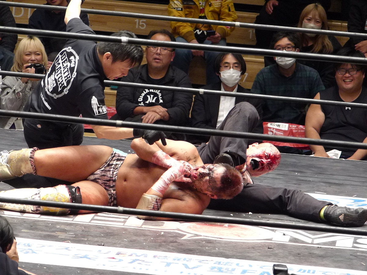 で、この爪楊枝は伊東やバーブに抜いてもらっていますしたが、意外と簡単に全部抜けきれず、一旦リング外にエスケープし、上級救命講習を長年受講しているというガチめな応急処置スキル持ちの吉野レフェリーに処置してもらっていました。吉野レフェリーは次戦のレフェリー担当なのにお疲れ様です…