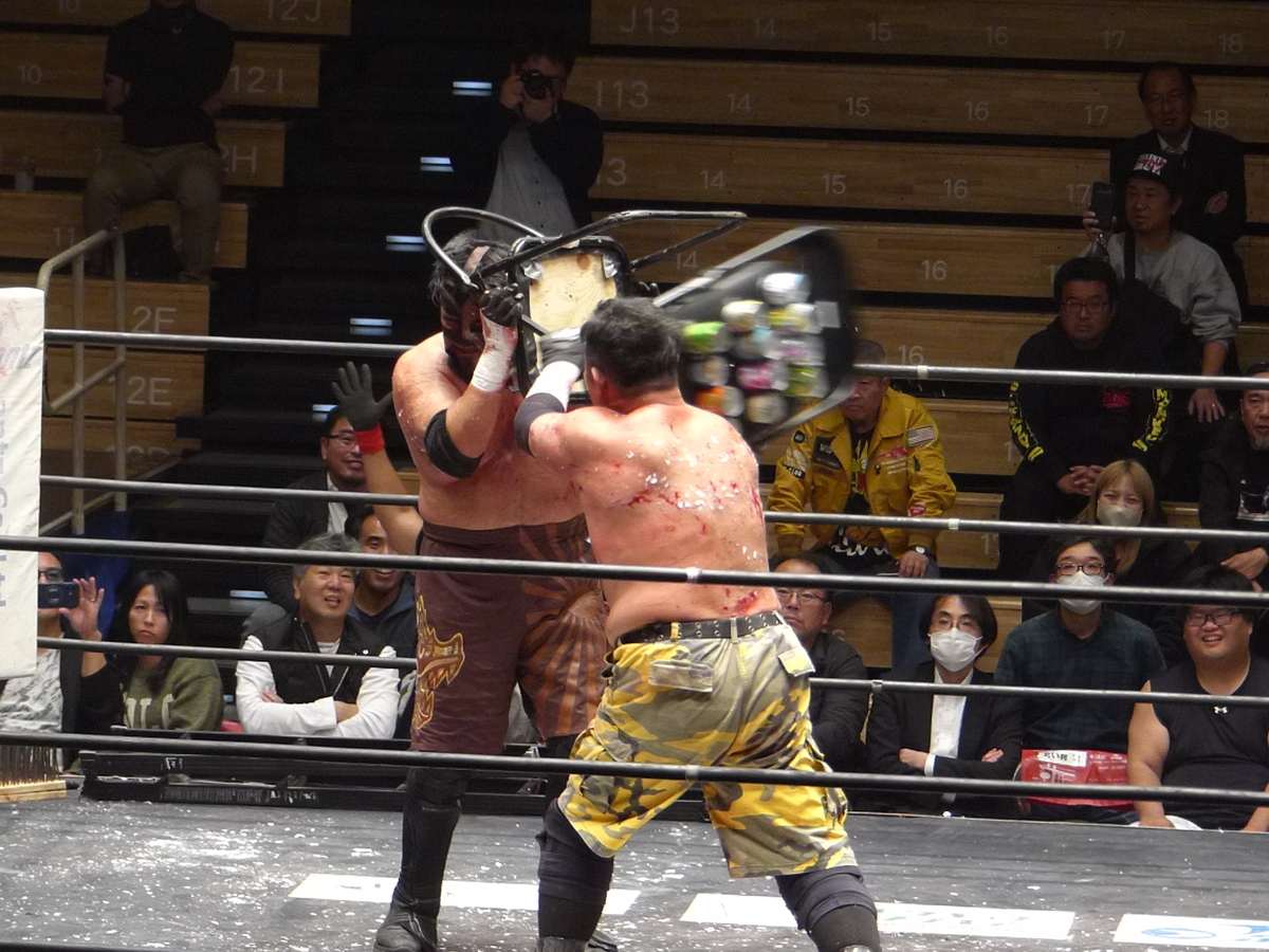 ゴング開始からぶつかり合う肉弾戦を展開していました。デスマッチ要素がオマケっぽい感じがしましたが、そんなKFCシングルも珍しいな。KFCシングル=ゴリッゴリのデスマッチになることが多いじゃないですか。